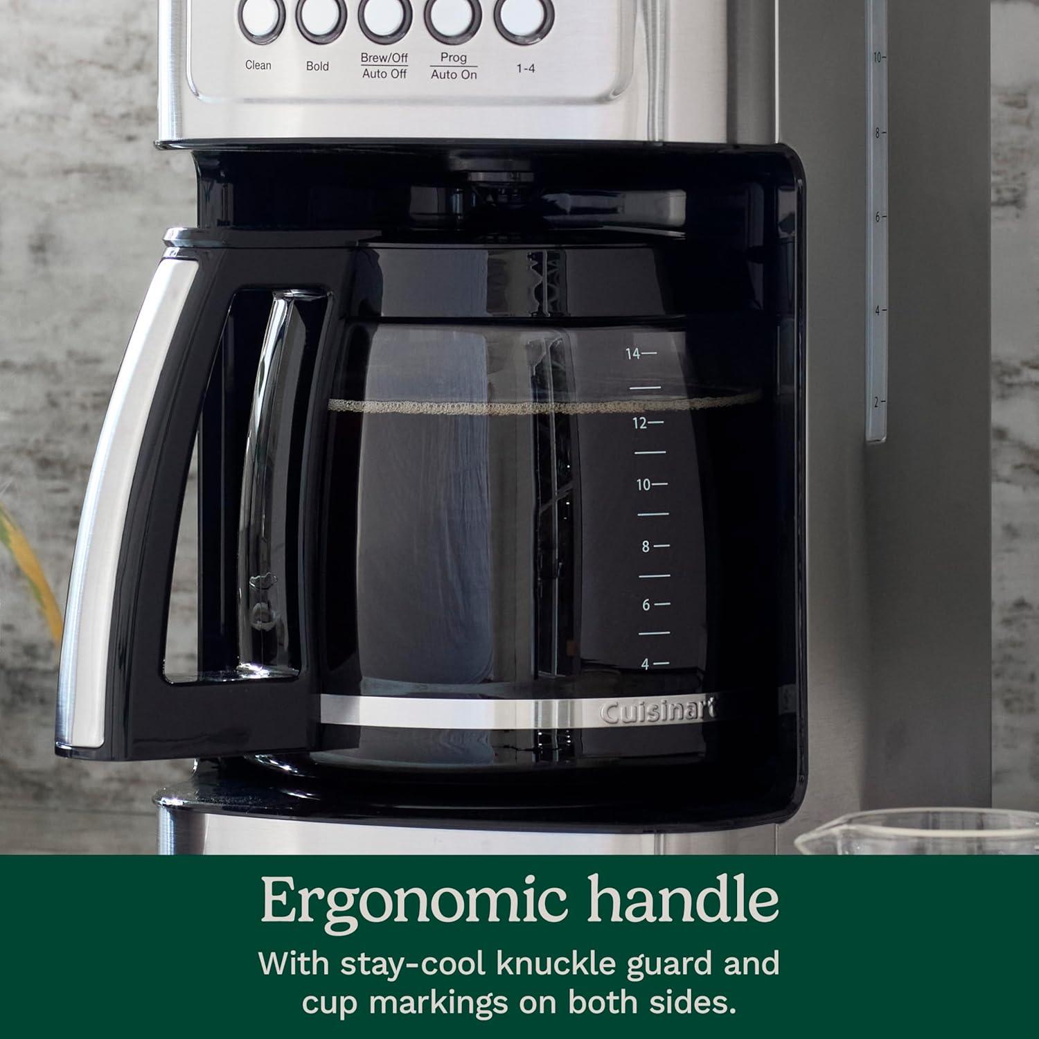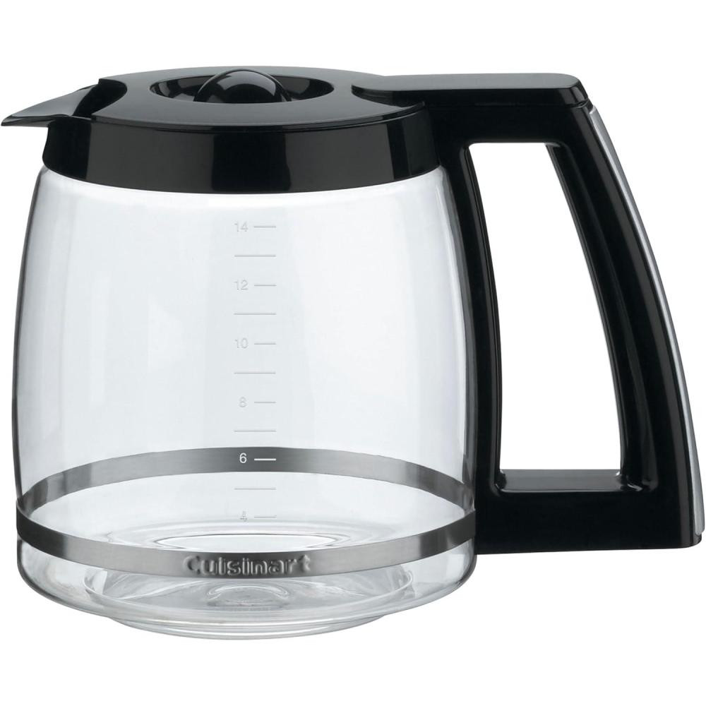Cuisinart 14 cup replacement glass carafe with a black lid and black and brushed chrome handle. This carafe is for use with DCC-2200 series and DCC-2600 coffeemakers.