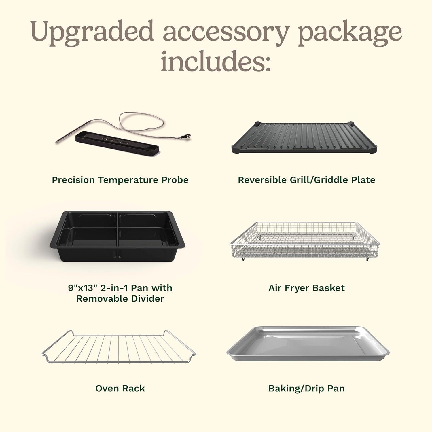 The Cuisinart® 15-in-1 Extra-Large Digital Air Fryer Oven with 1800 watts, wide temperature range of 80°F–450°F, and extra-large 0.90-cubic-foot stainless steel oven interior with light can air fry 4 lbs of wings, cook a 13 lb turkey or 5+ lb chicken, toast 9 slices of bread, and bake a 13″ pizza. Featuring 10 cooking functions including air fry, toast, bake, broil, roast, warm, pizza, low, dehydrate, and grill, this air fryer countertop oven contains 5 pre-programmed presets to cook fries, wings, vegetables, snacks, and nuggets for unlimited culinary innovation. The uniquely modern door with integrated control panel and extra-large viewing window gives this digital air fryer oven a contemporary look that complements any kitchen space. An IntelliTemp Temperature Probe with precision sensors reads precise temps and cooks perfect proteins every time. Along with an oven rack, air fry basket, and removable crumb tray, this air fryer also includes a versatile 9″x13″ baking pan with removable divider to cook two different foods at once, or for dietary preferences; Use the full pan for larger meals and batch cooking. Grill year-round indoors with included ceramic non-stick reversible grill/griddle, known for even heat and excellent heat retention. The Cuisinart® 15-in-1 Extra-Large Digital Air Fryer Oven TOA-112 comes with a limited 3-year warranty.