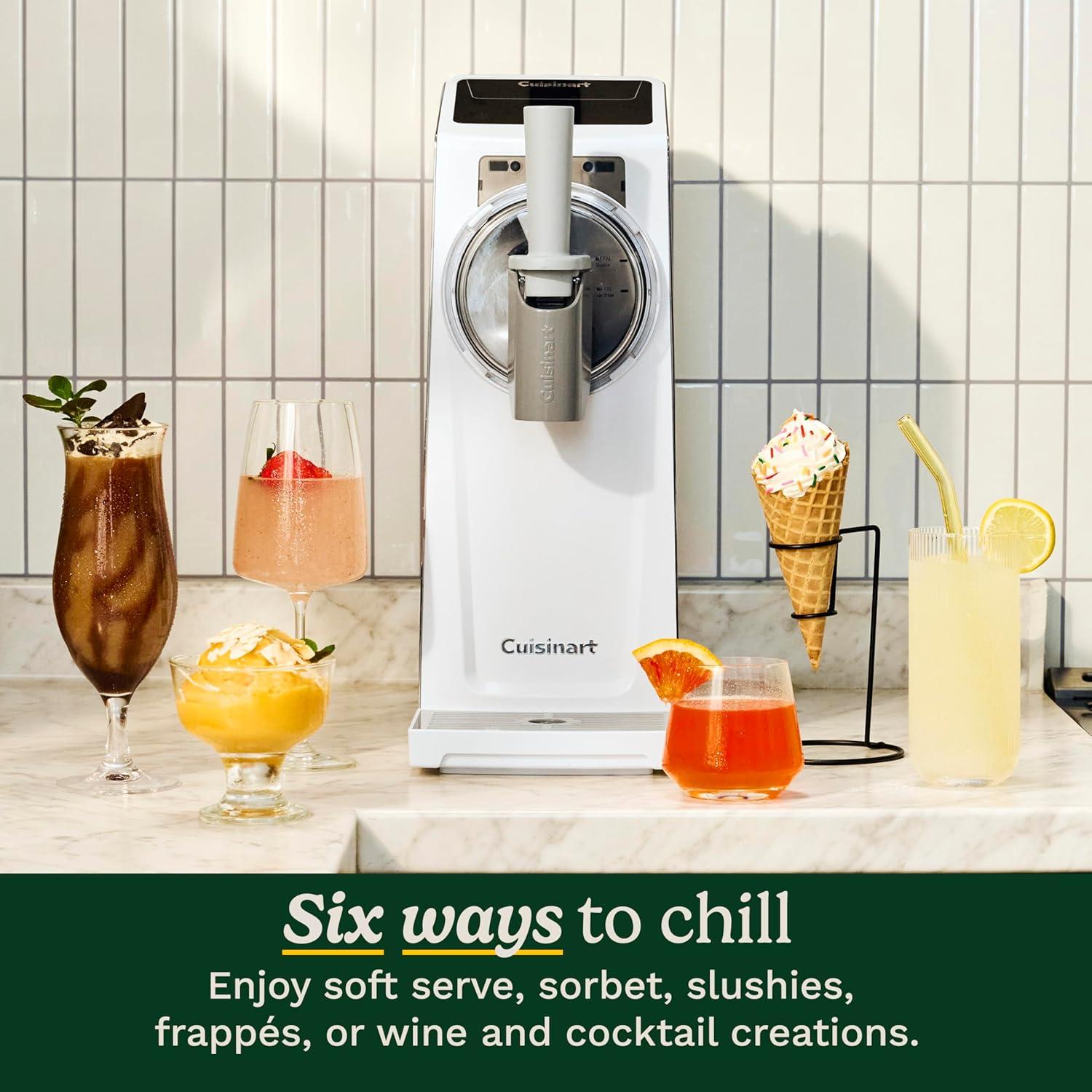 The Cuisinart 6-in-1 Slushy & Soft-Serve Maker ice cream machine lets you make frozen treats at the touch of a button, no pre-freezing required. This innovative Slushy & Soft-Serve Maker features six preset programs to craft soft-serve ice cream, sorbet, slushies, cocktails, frappes, frozen wine, and more. The intuitive design utilizes simple controls, presets and a smart dispense control to automatically control the speed and direction for smooth dispensing. To help maintain the perfect temperature, the Cuisinart Slushy & Soft-Serve Maker features quick freeze chill technology which uses a powerful compressor to keep your treats at the perfect temperature and consistency. Able to produce 1.7-quarts of frozen treats in as little as 15 minutes, the Slushy & Soft-Serve Maker is powered by an ultra-quiet motor and is ideal for parties and family gatherings. The Cuisinart 6-in-1 Slushy & Soft-Serve Maker ICE-200 comes with a limited 3-year warranty.