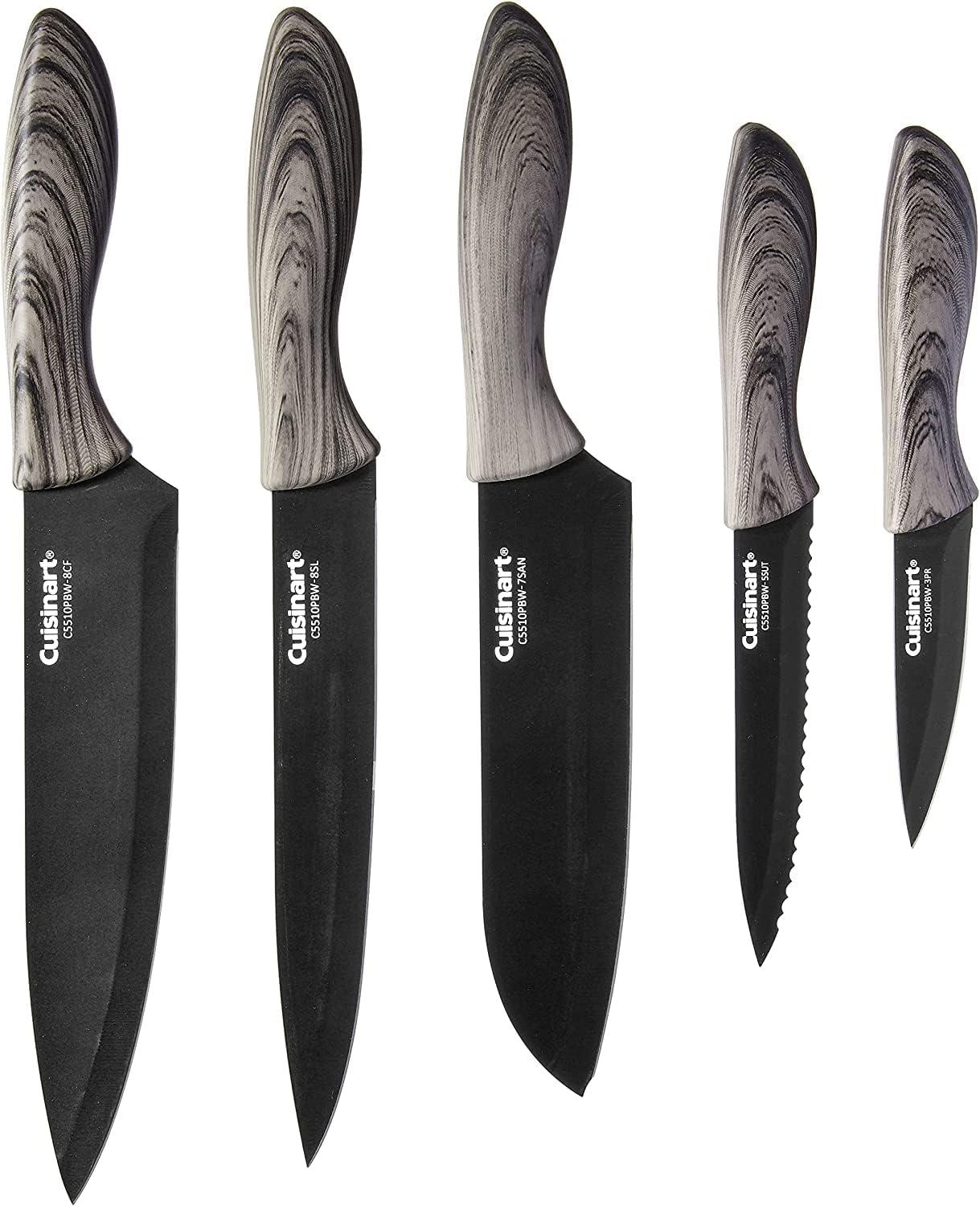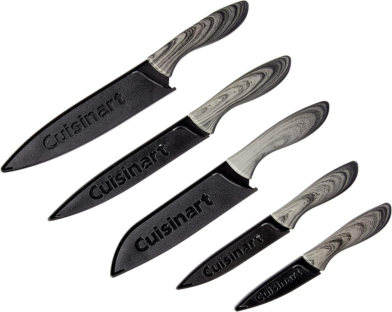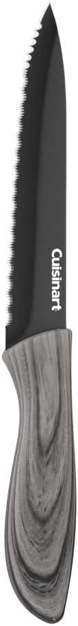 Aspiring chefs will love the attractive faux-wood design of this Cuisinart Advantage knife set. High-quality stainless steel blades Premium black faux-wood design with soft grip Nonstick ceramic coating for easy slicing Each knife comes with its own blade guard for protection and safety.