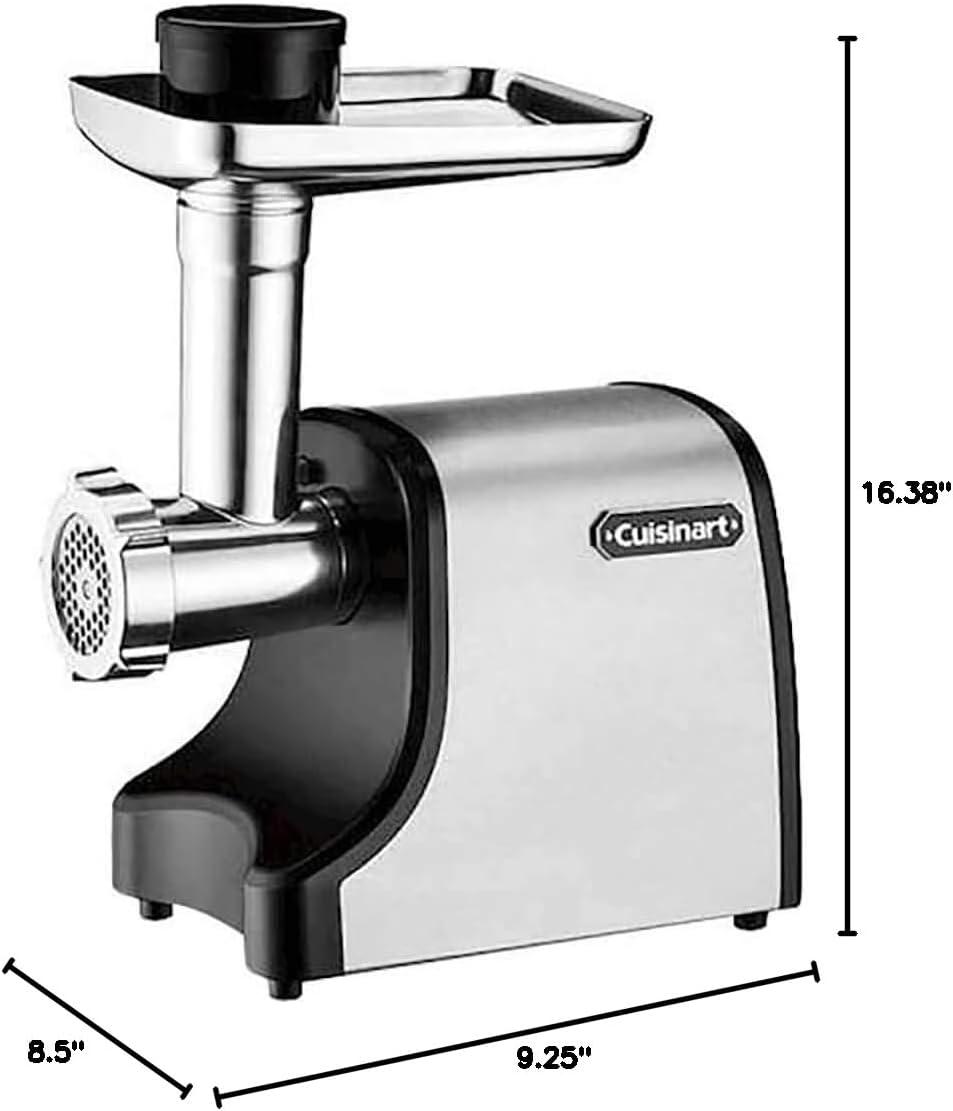 The Cuisinart Electric Meat Grinder effortlessly grinds a wide variety of meats. meatloaf, meatballs, sausages, chili, and pates. The powerful 300-watt motor quickly grinds up to 3 pounds per minute, for professional grinding results. The grinder offers plenty of options with 2 cutting plates for medium and coarse thickness, as well as 2 sausage attachments for breakfast links and regular sausages. The single on/off switch, along with a reverse feature make operation as simple as can be.